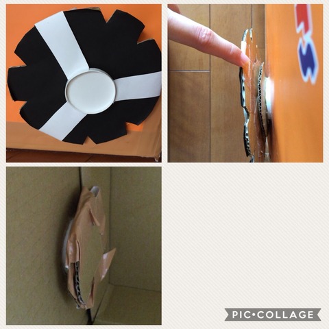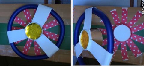 - タイヤは段ボールをまるく切って、黒色の画用紙を貼る(切り込みを入れるとよりタイヤっぽく^^)
